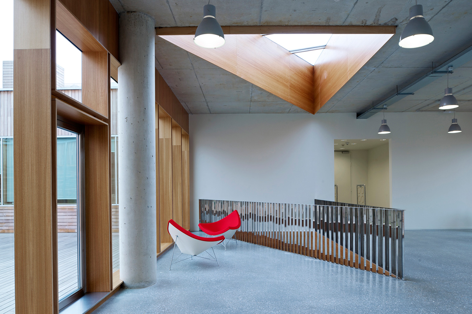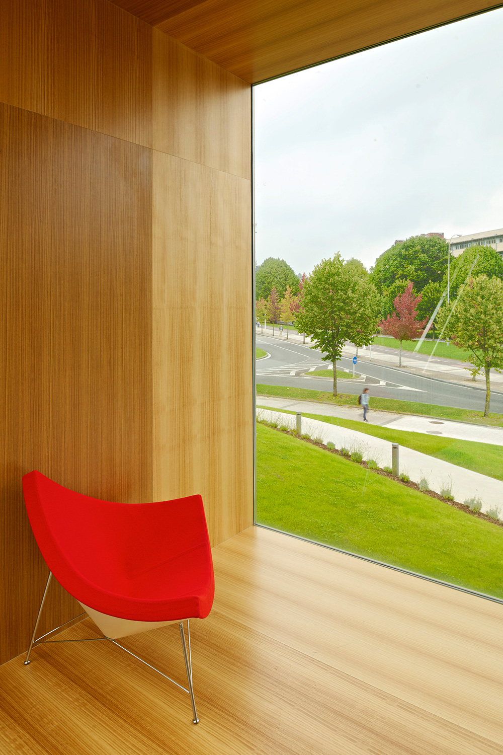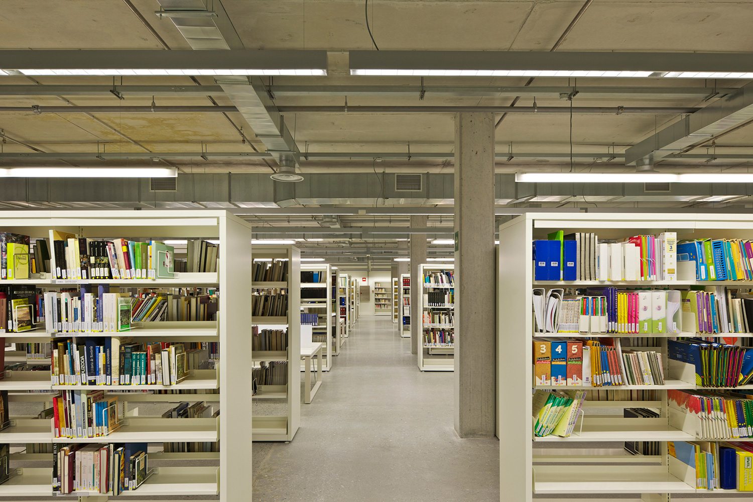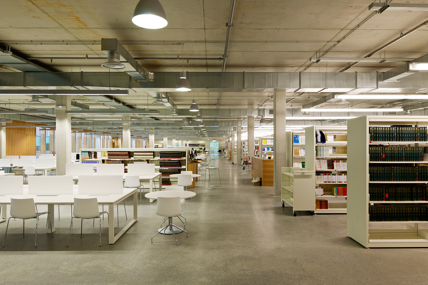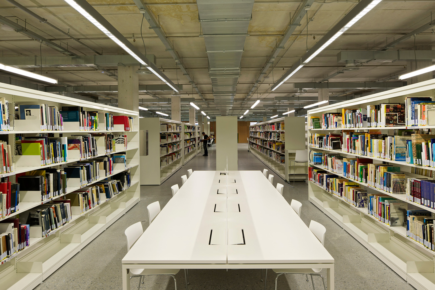 Een binnenplaats scheidt het twee-verdiepingen tellend gebouw, in twee asymmetrische delen. De grootste kant van het gebouw herbergt de boekencollectie van de bibliotheek. De andere, kleinere kant van het gebouw, biedt plaats aan studeerkamers en een collegezaal. BCI leverde maar liefst 17.000 strekkende meter van de 60/30 rekkensystemen met 40 mm eindpanelen en bovenlegborden. Speciaal ontworpen witte boekenwagens maken het interieur compleet.
