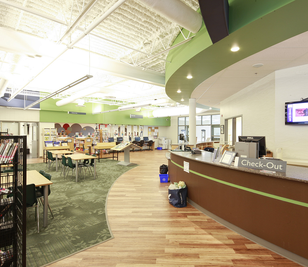 De nieuwe bibliotheek is uitgerust met de laatste technologie zoals zelfuitleenbalies, OPAC –stations en RFID tags in de volledige collectie, maar het is ook een plek van ontspanning. Een golvende glasgevel, ronde glaspartijen en zwevende, golvende akoestische panelen zorgen voor een sfeer van rust én activiteit. Ruimtes voor verschillende activiteiten omsluiten een grote open binnenruimte, de aanliggende ruimtes zijn visueel verbonden met de bibliotheek.