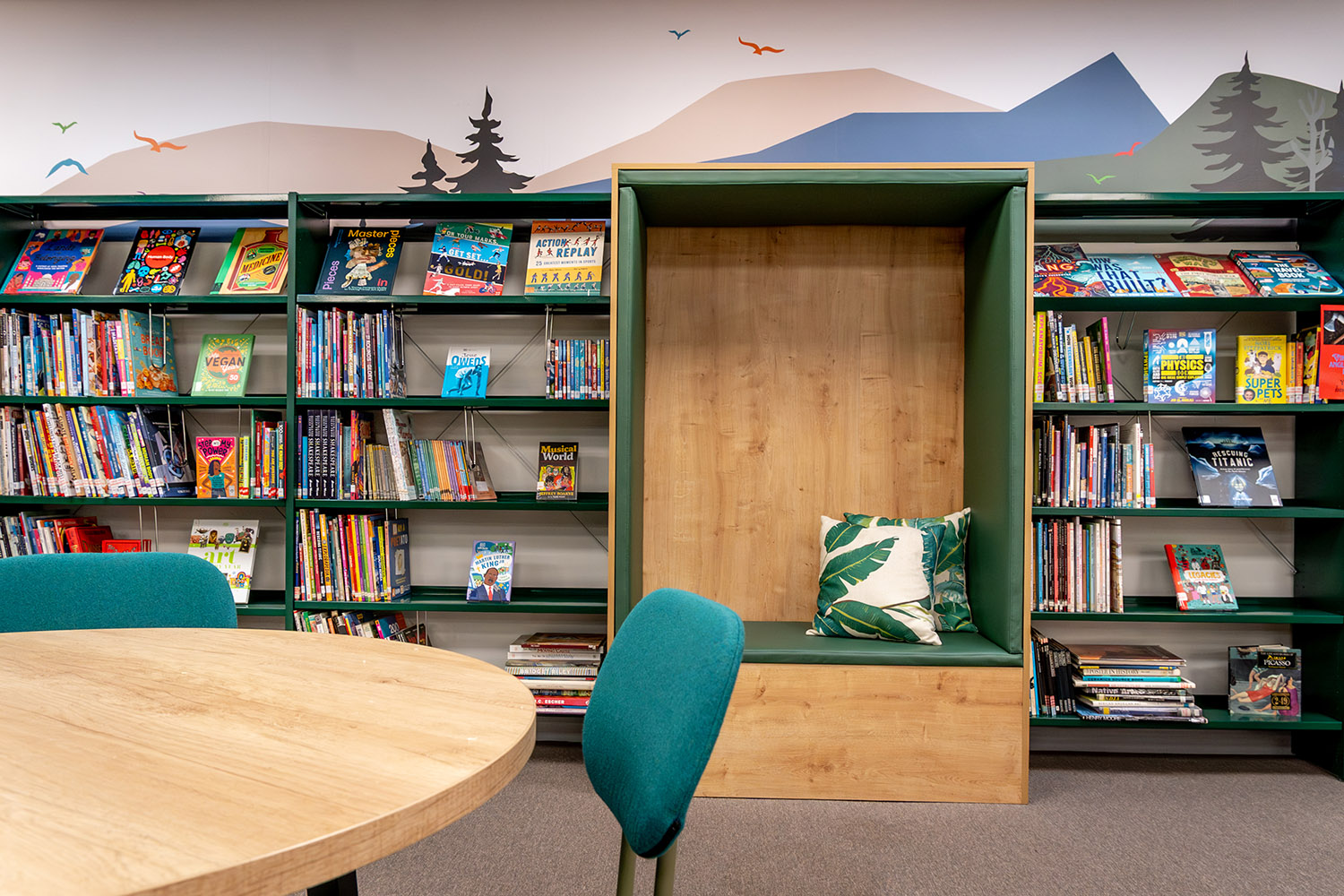 De grafische elementen zijn ontworpen met de hulp van de leerlingen zelf, wat een persoonlijk tintje geeft aan de ruimte. De kleuren van het zachte meubilair en de groene rekken zorgen ervoor dat alle aspecten van het bibliotheekontwerp naadloos in elkaar overgaan.