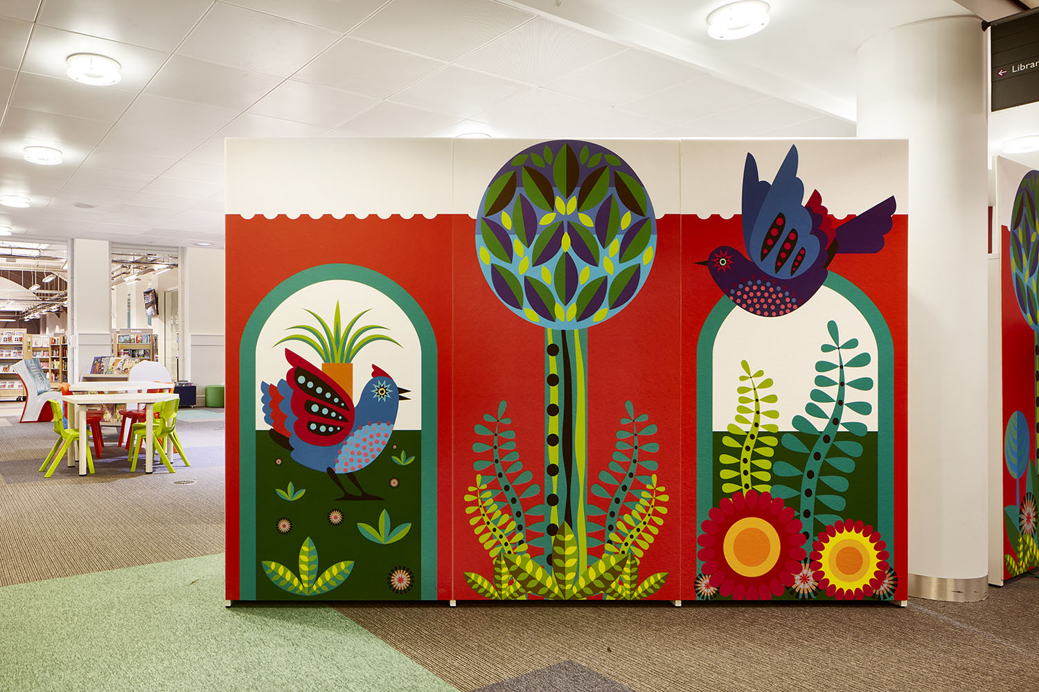 De nieuwe kinderafdeling werd ingericht in een centraal en open atrium, waardoor de duidelijke afbakening van de zone het team voor een heuse uitdaging plaatste, om het onderscheid met de andere bibliotheekinvulling in de verf te zetten. Onze ontwerpers vonden een oplossing in het gebruik van akoestische panelen met een uniek en kleurrijk decoratief ontwerp rondom de kinderafdeling, waardoor het onderscheid duidelijk is, zonder afbreuk te doen aan de visuele identiteit.