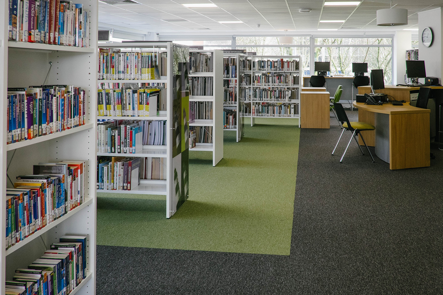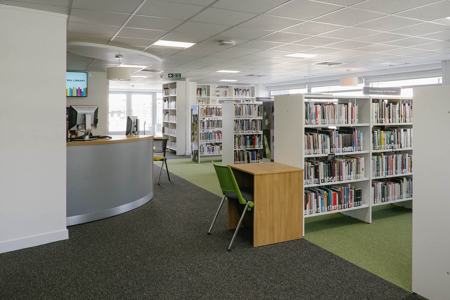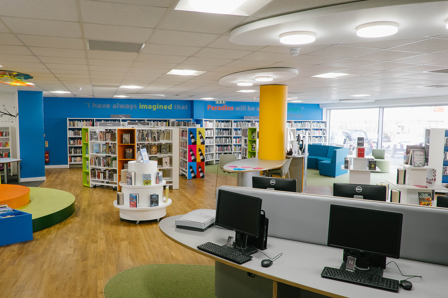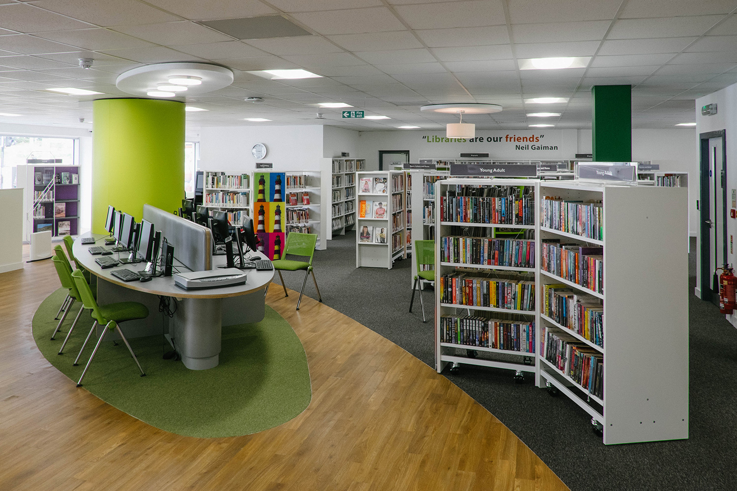 Het verhaal begon met een nieuw pand want de bibliotheek moest heropenen in het hart van de stad, omringd door diverse commerciële ruimtes. Thedesignconcept was zeer enthousiast om een bibliotheek te ontwerpen die in het oog zou springen en de bezoekers zou aanmoedigen om de bibliotheek te bezoeken. Het ontwerp kwam tot leven rond de “statement tree” die centraal staat in de kinderafdeling en dewelke omringd is door fel gekleurde meubels en op maat gemaakte illustraties waardoor er een levendige en gastvrije omgeving voor alle bezoekers werd gecreëerd.