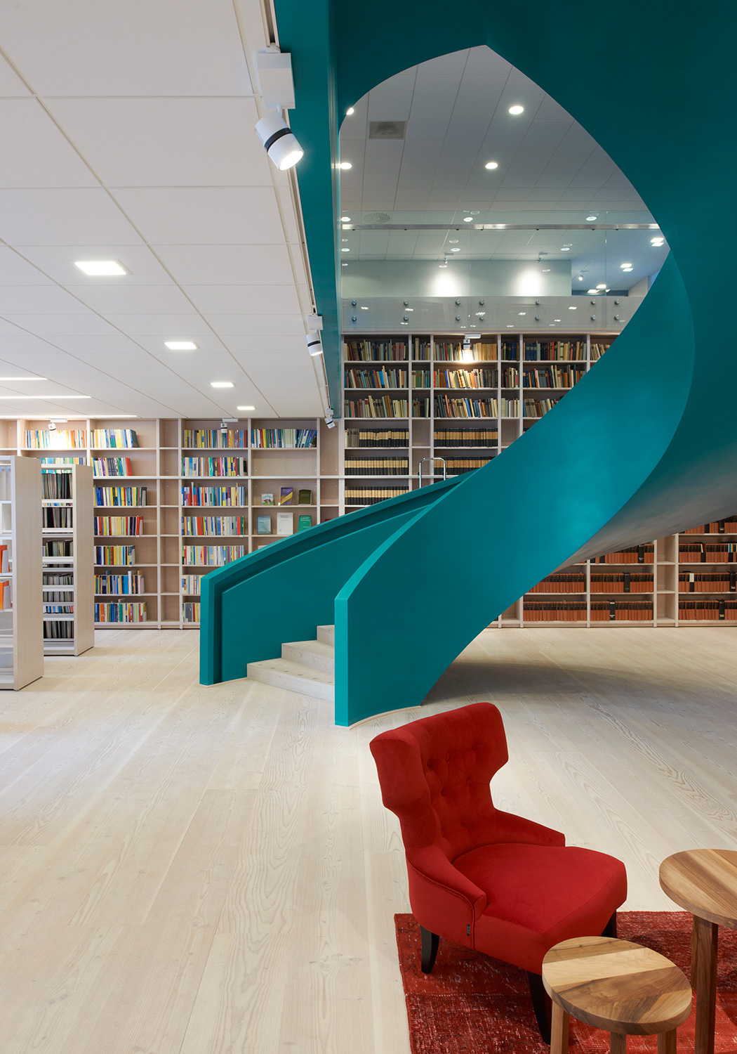 Eén van de grootste private bibliotheken in West-Zweden over twee verdiepingen. De sleutel van het interieurconcept is het consequent gebruik van Oregon den. De massieve houten vloer, boekenkasten en ander meubilair – allemaal vervaardigt uit Oregon. De inspiratie komt uit traditioneel ingerichte Britse bibliotheken. De architecten wilden in de bibliotheek een gevoel van traditie en erfgoed onderbrengen. Authenticiteit is een sleutelwoord. Maar er is ook ruimte voor meer edgy details zoals de golvende trap in expressief turkoois.