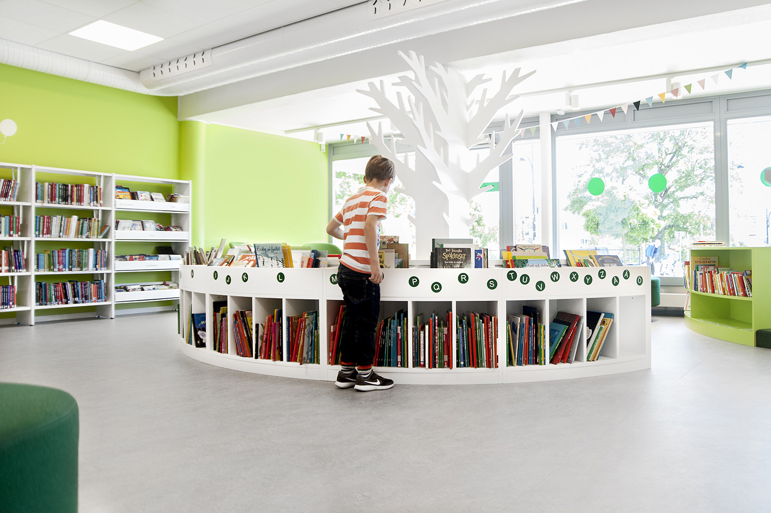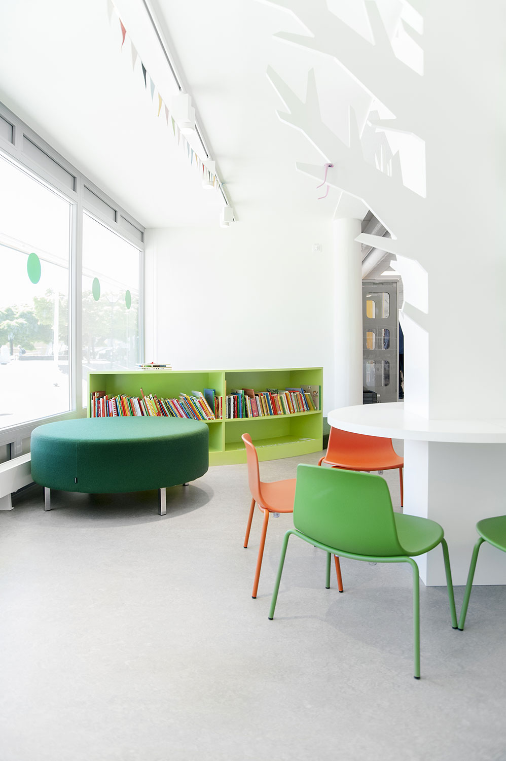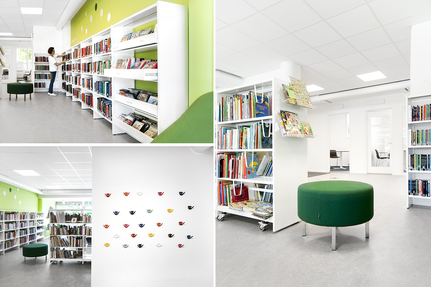 De bibliotheek is nu groter; 400 vierkante meter en met veel activiteiten. De ruimte voor kinderen is uitgebreid en kinderen hebben nu toegang tot hun eigen gezellige hoek. In aanvulling op het lezen en lenen, kunt u er nu ook groepsruimten reserveren, studeren, computers gebruiken, taalcursussen bijwonen en nog veel meer. Grote nadruk is gelegd op duidelijke bewegwijzering en de muren en vloeren werden voorzien van rustgevende kleuren terwijl het interieur overwegend in het wit is.