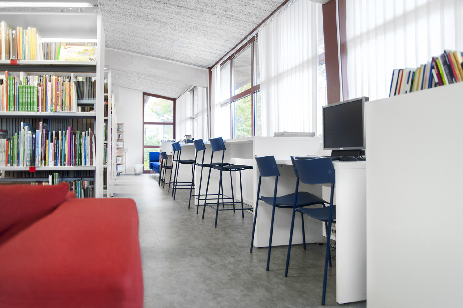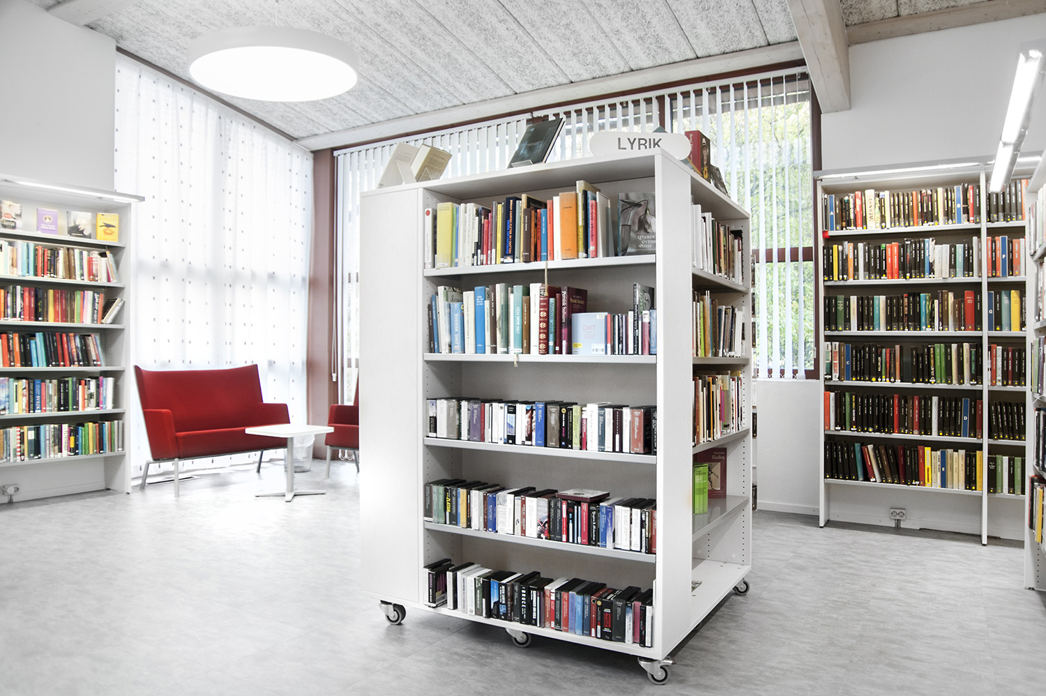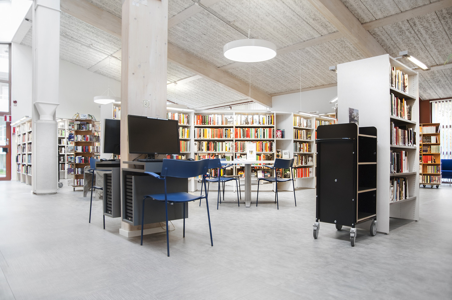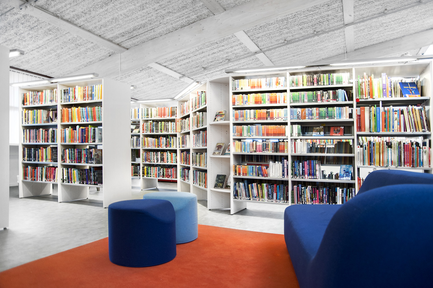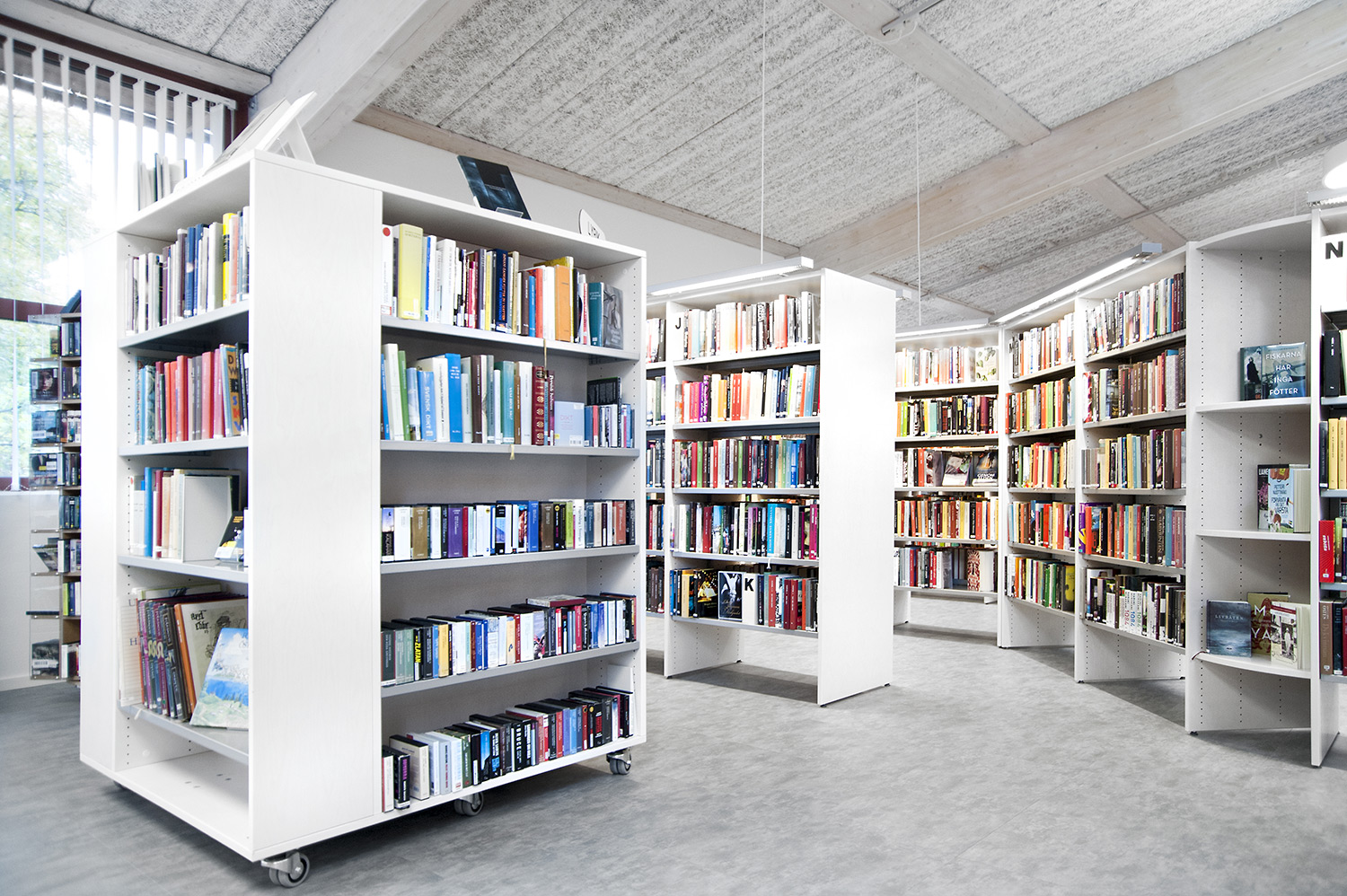 Lammhults Biblioteksdesign heeft het Slimline rekkensysteem geleverd met Big Book verlichting. De legborden en de bovenlegborden zijn vervaardigd uit wit gepigmenteerd berken, terwijl de andere legborden vervaardigd zijn uit zilverkleurig staal. Dezelfde rekken wordt gebruikt in de magazijn-afdeling; Slimline op wielen, met presentatielegborden in het bovenste deel en deuren onderaan om de onderste legborden te bedekken.