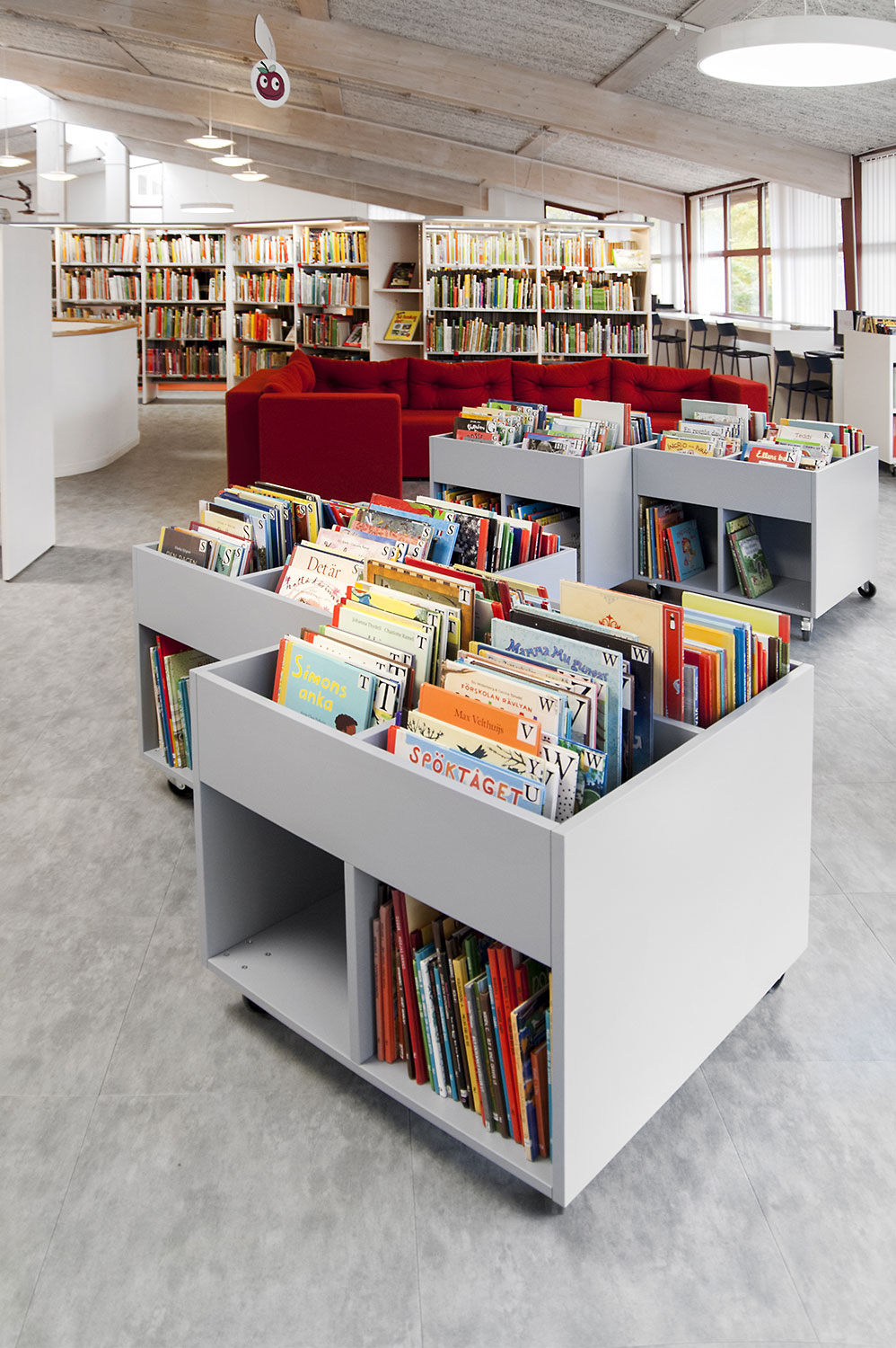 De bibliotheek heeft het interieur volledig gemaakt door toevoeging van een serie “stand-alone producten” van Eurobib Direct. De presentatiestandaard Maria in combinatie met de Uilen standaards zorgt ervoor dat de aanwezige boeken op een toegankelijke manier gepresenteerd worden. De Quattro-display toren - hier in het oranje, is een goed alternatief voor de boek carrousels die vaak worden gezien in de meeste bibliotheken en de Box prentenboekenbakken bieden zowel display als opslag in de kinderafdeling.