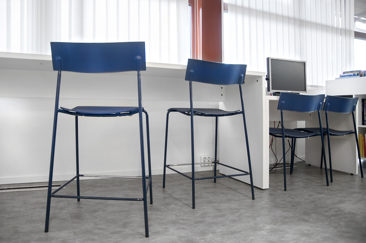 Elektrische, in hoogte verstelbare bureau’s; Concertina, maak voor de hand liggende informatiepunten in de bibliotheek, en biedt een ergonomische werkomgeving voor het personeel.