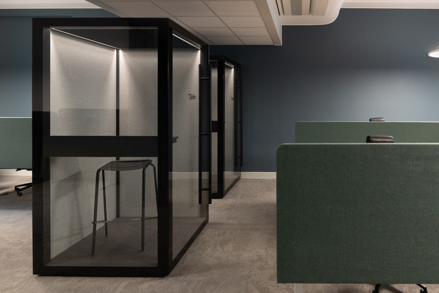 Zen Pod® combineert geavanceerde geluidsabsorberende technologie met een elegant ontwerp. Twee wanden zijn voorzien van akoestisch glas, terwijl de overige wanden geluidsabsorberend zijn en zowel aan de binnen- als buitenzijde bekleed zijn met textiel. Het plafond biedt ook geluidsisolatie met aangename verlichting.